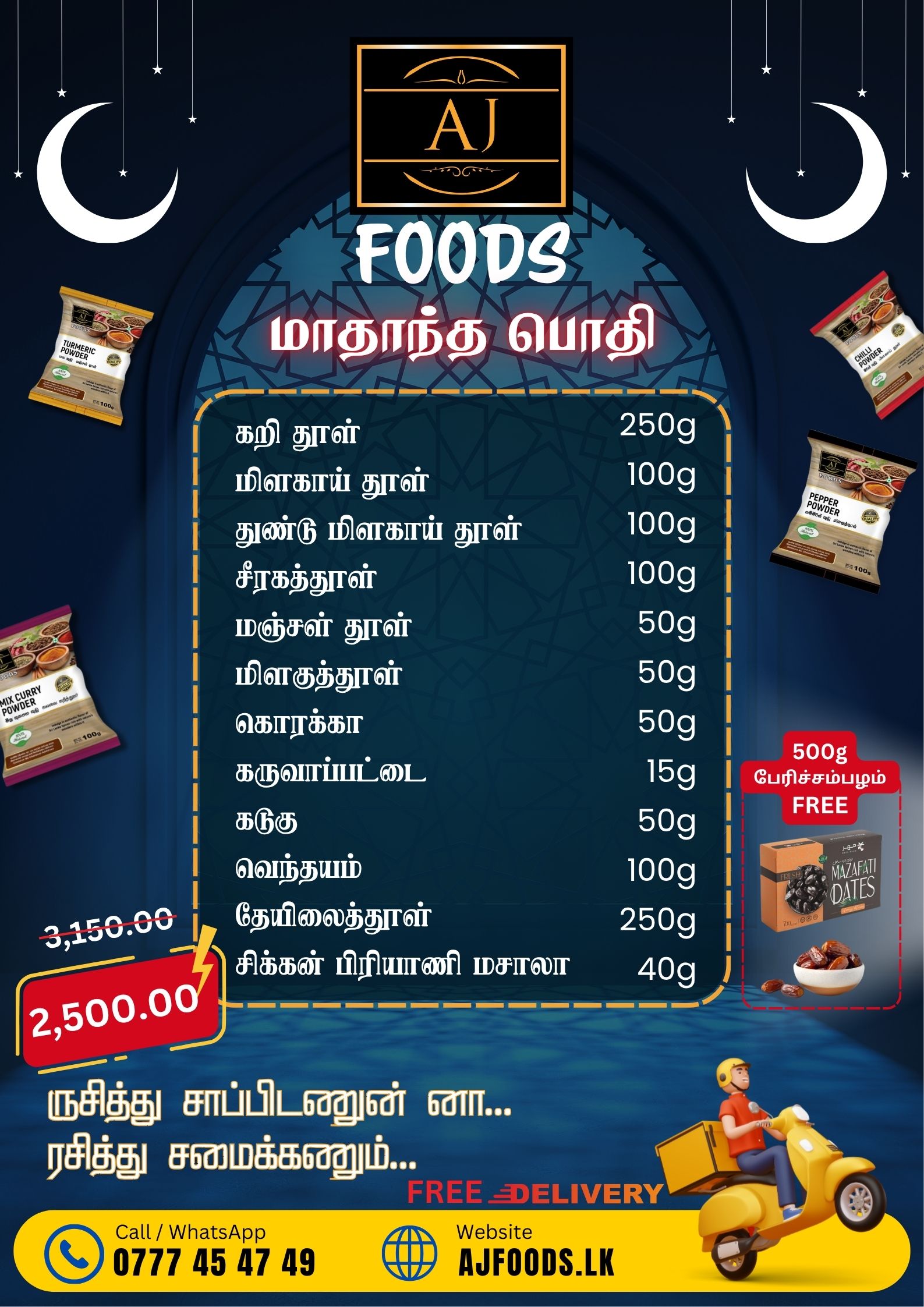 We designed attractive and festive Ramadan combo offer posters for AJ Foods, promoting their premium range of Sri Lankan spice and grocery products. The design combines cultural elements, elegant typography, and bright highlights to capture the festive spirit while clearly showcasing product details and special offers.