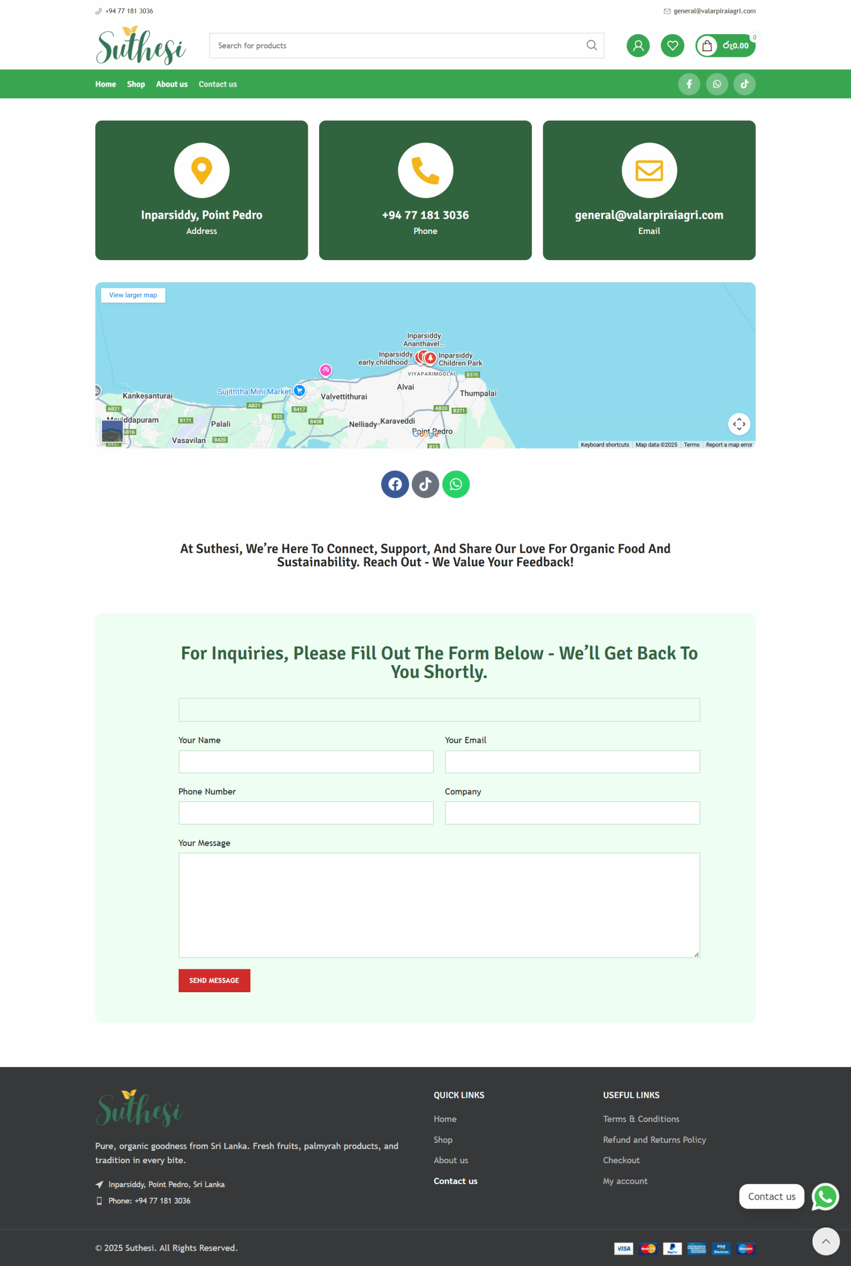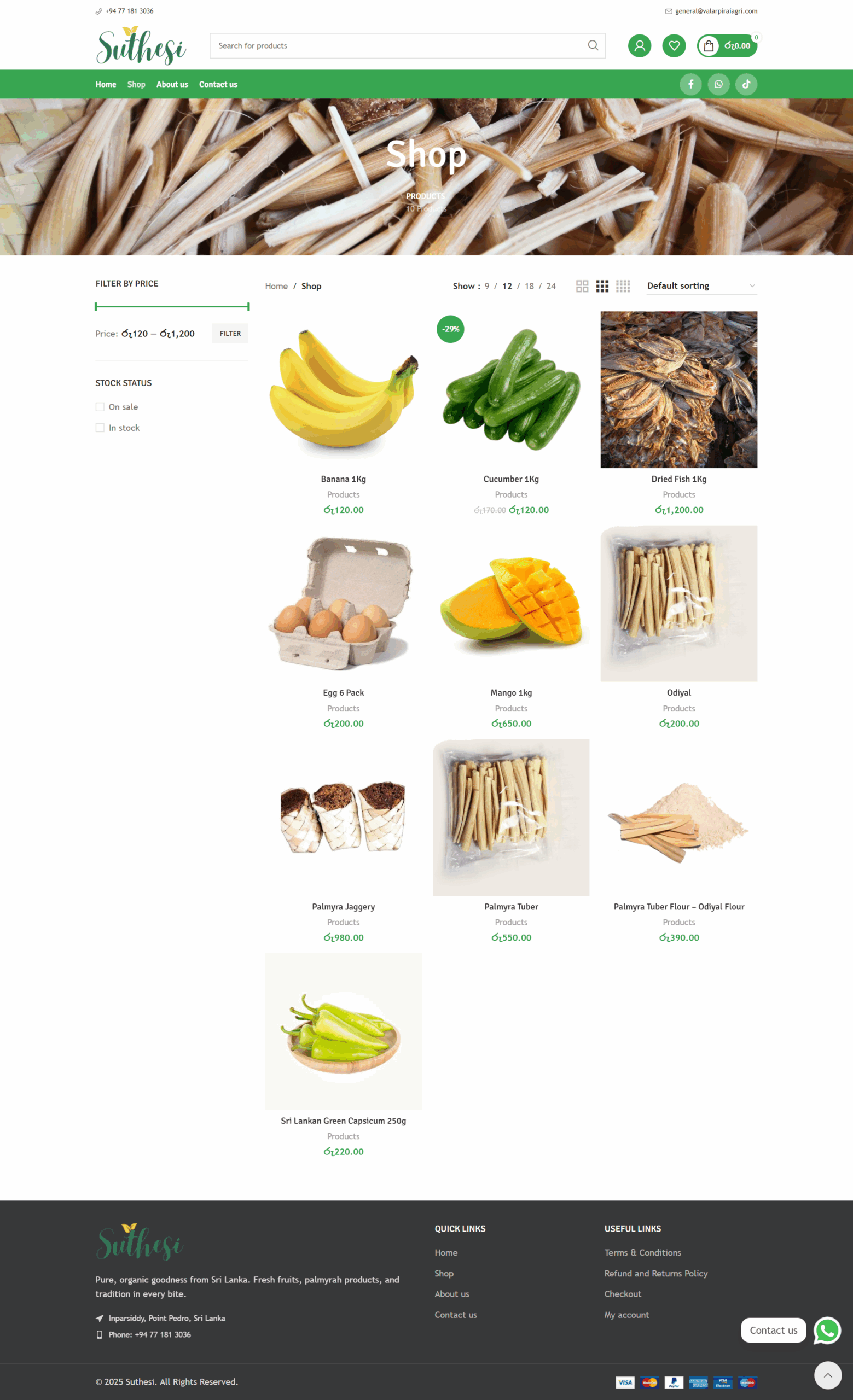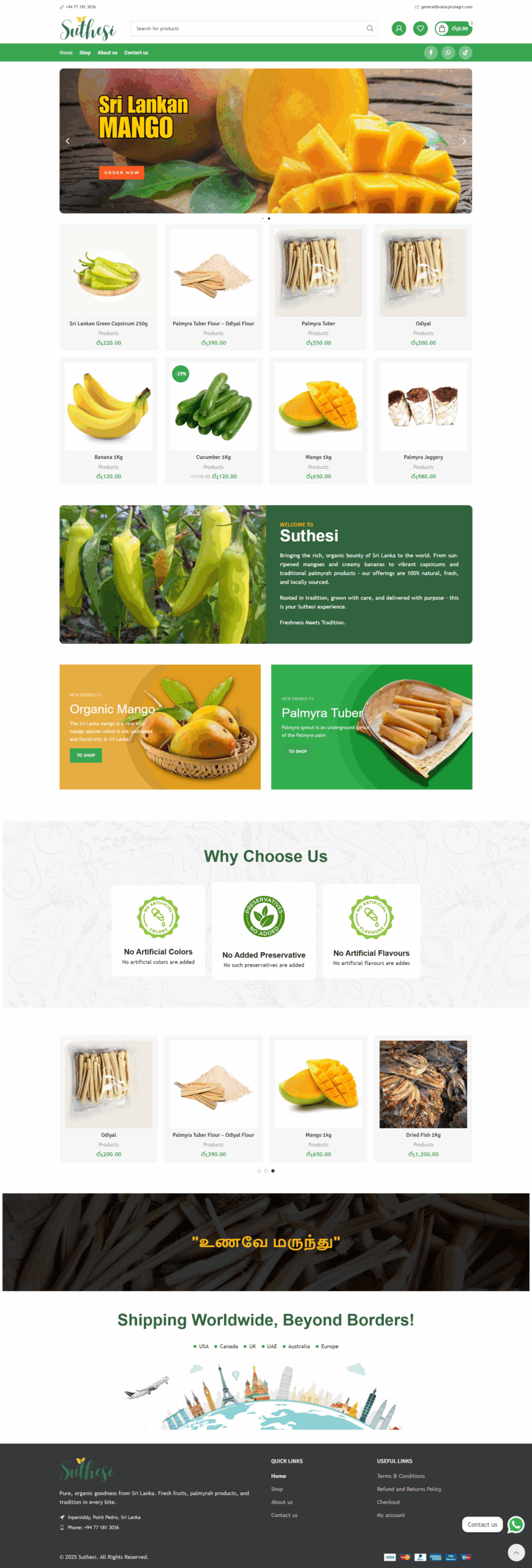 We designed a fresh and modern eCommerce website under the brand Suthesi.lk. The platform enables online sales of locally manufactured products such as fresh cucumber, green capsicum, and palmyrah-based items. The website highlights natural freshness, simple navigation, and a seamless shopping experience for customers across Sri Lanka.